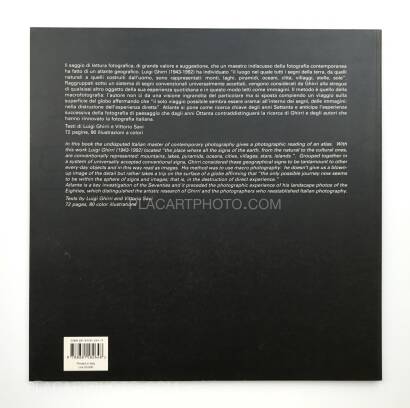 In this book the undisputed Italian master of contemporary photography gives a photographic reading of an atlas. With this work Luigi Ghirri (1943-1992) located "the place where all the signs of the earth, from the natural to the cultural ones, are conventionally represented : mountains, lakes, pyramids, oceans, cities, villages, stars, islands". Grouped together in a system of universally accepted conventional signs, Ghirri considered these geographical signs to be trantamount to other every-day objects and in this way read as images. His method was to use macro photography : he doesn't give us a blown-up image of the detail but rather takes a trip on the surface of a globe affirming that "the only possible journey now seems to be within the sphere of signs and images ; that is, in the destruction of direct experience." Atlante is a key investigation of the Seventies and it preceded the photographic experience of his landscape photos of the Eighties, which distinguished the artistic research of Ghirri and the photographers who reestablished Italian photography.